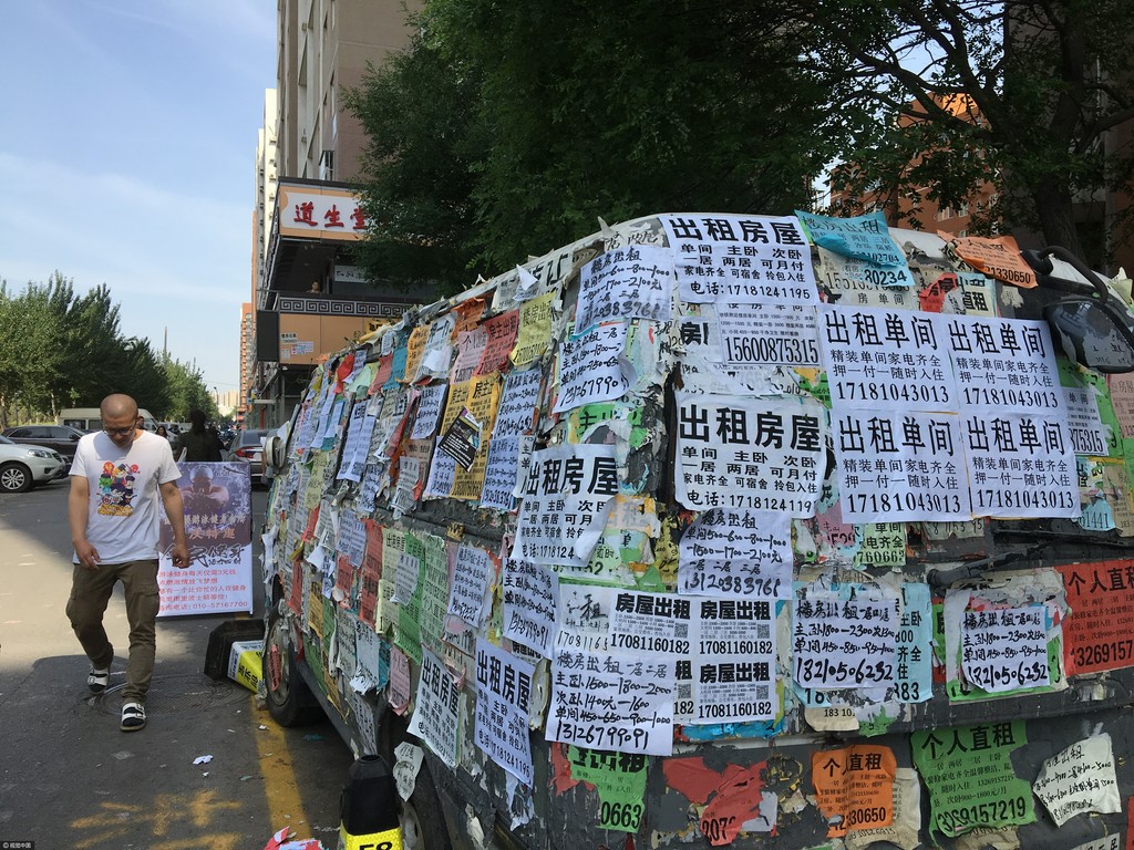 在北京朝陽區褡褳坡地鐵站,一輛大馬路邊的廢舊汽車上被貼滿了各式各樣的房屋租售小廣告,前前後後貼得滿滿的,連車窗跟後照鏡都無一倖免,而且看得出這些廣告都是重複堆疊,表示這種情況已經持續一陣子了,讓人不禁好奇汽車被貼滿廣告的原因。