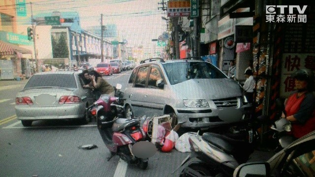 在7日下午3點多,一輛銀色轎車在等紅燈時突然爆衝,直接逆向撞上對向車輛,導致9輛機車、2輛轎車遭受攻擊,也使得有13人因此受到輕傷。據目擊者說法,當時現場相當驚險,路人全被嚇壞,還一直不停尖叫,甚至有人被壓在汽車下,而銀色休旅車則是自撞電線桿後才停下來。