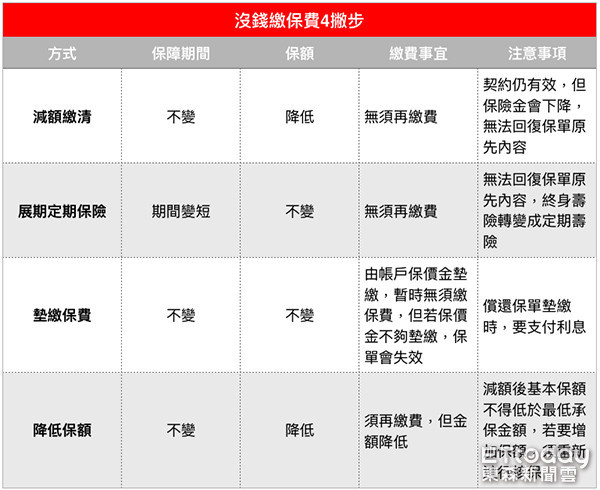 ▲沒錢繳保費時,專家建議千萬不要因小失大而解約,善用幾個權宜方法,仍可保有相關保障及效力。(圖/記者官仲凱製表,資源來源為採訪整理)