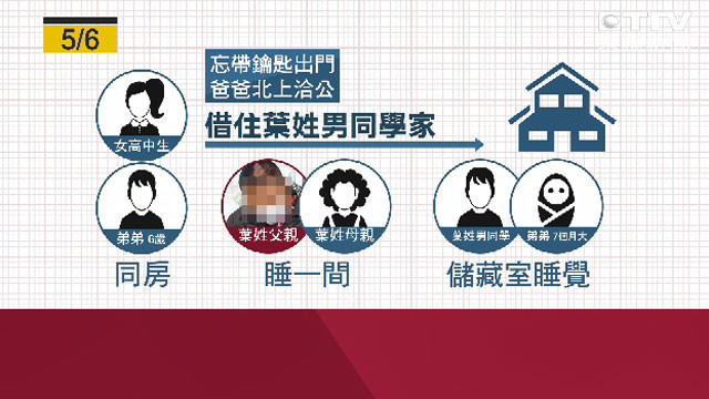 桃園一名女高中生小琪(化名)6日晚間到好友葉姓男同學家過夜,沒想到竟遭對方爸爸性侵。好友得知後感到十分懊悔,認為應該付出責任,大義滅親向警方報案;父親訊後依妨害性自主罪嫌被移送偵辦。據警方表示這名嫌犯有酗酒的習慣,常常動手打妻子,導致一家人長期活在家暴的陰影中。
