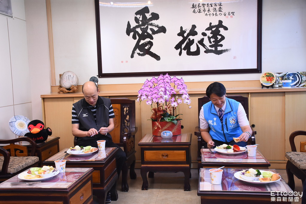 ▲國民黨主席候選人韓國瑜,前往花蓮市公所與魏嘉賢市長共進有機早餐。(圖/花蓮市公所提供 下同)