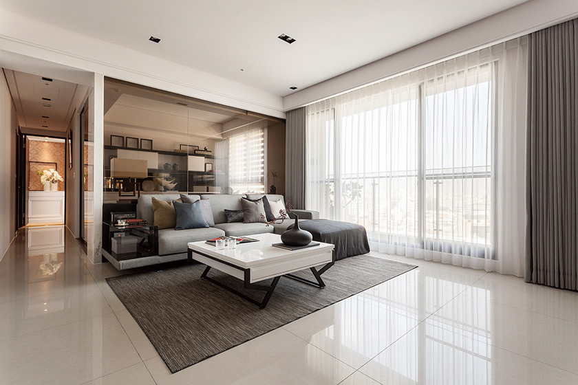 同樣的流暢與和諧也呈現在公私區域的基調統一、廊道天頂造型與牆面線條延伸上;男主人偏好簡潔幽靜的客餐廳,女主人希望私領域帶有新古典的精緻典雅,於是李敏郎總監以純淨為主調性,由客餐廳穿透茶玻至書房,沿廊道至主臥房,再轉入更衣區,優雅的白無所不在,純白背景上搭配細節的語彙轉化,風格的漸次改變悠揚而圓滑。