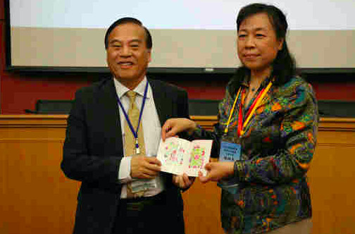 ▲山東大學圖書館副館長楊錦先(右),贈送剪紙作品給義守大學蕭介夫校長(圖/翻攝自義守大學網頁)