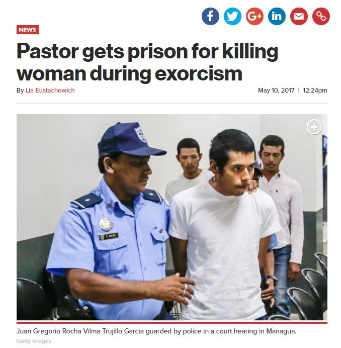 尼加拉瓜23歲的牧師羅查(Juan Rocha),今年2月連同四名門徒綁架一名25歲的女子楚希尤(Vilma Trujillo),授以「驅魔」名義將人活活燒死。當地法院重判36年徒刑,不過尼加拉瓜規定累計最高限度為30年,因此予以減刑。據悉,死者生前被囚禁在常去的教堂將近一週,在缺乏水與食物的供給下凌遲致死。