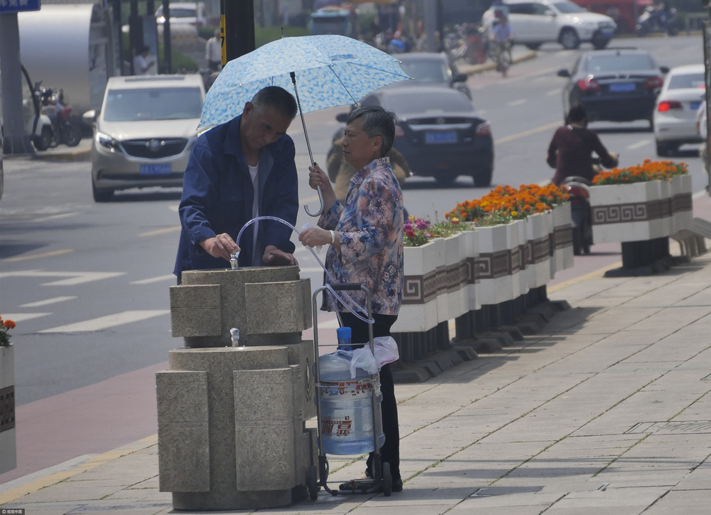 ▲老夫婦拿著大桶子來裝水,其中1人還幫忙撐傘。(圖/視覺中國)