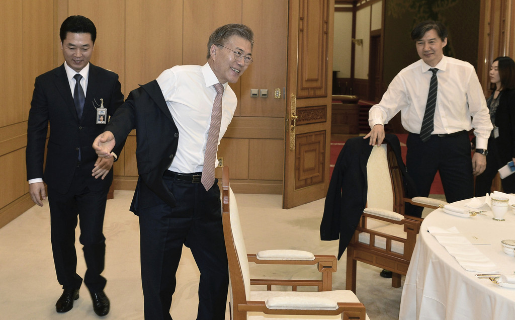 南韓總統文在寅11日在青瓦台與新任首席祕書官員進午餐,就在準備坐下前,他想脫掉外套時身後的祕書見狀前往幫忙,文在寅卻制止說「沒關係,我自己來。」這段畫面曝光後引起外界熱議,網友們紛紛稱讚文在寅「根本是暖男」。