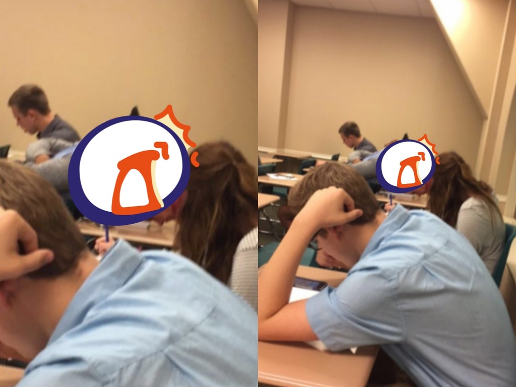 就讀於美國東德克薩斯浸會大學(ETBU)的推特網友StrandMan,8日拍下一張在期末考週的教室內的模樣,一位同學低著頭、墊著課本打嗑睡,看起來不稀奇。但狂的是,前方的穿帽T、戴著黑色帽子的同學,以仰天豪邁的睡姿,把頭向後仰,讓兩顆頭完美、和諧地重疊在一起,網友還補充說:「我很確定他們不認識!」