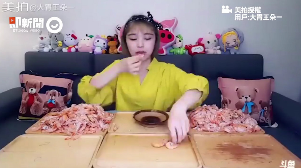 影片開頭,就看到「大胃王朵一」的桌上放滿了6大盤的蝦子,並開始介紹她這次準備的是自己煮的「基圍蝦」,接著她便拿起蝦子,一隻一隻剝殼後往嘴巴裡送,中間也沾起醬油吃的津津有味,影片接近尾聲,桌上堆的蝦殼也越來越高,最後終於把整桌的蝦子通通吞下肚了。而許多網友也對「大胃王朵一」的食量感到驚訝不已。
