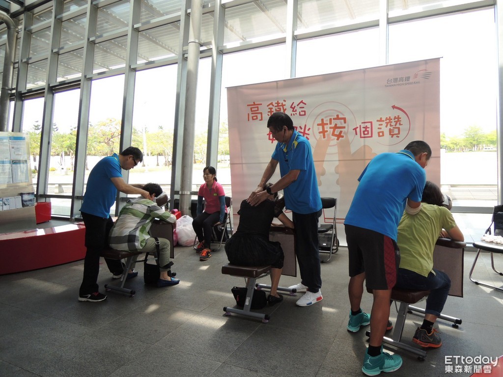 高鐵台南站表示,為犒賞平日忙於家務的媽媽們,有感於她們大部分都有肩頸僵硬及酸痛等症狀,台南站特別請專業的按摩師給媽媽們按摩,很多媽媽都開心直說好舒服,身體也輕鬆了許多。