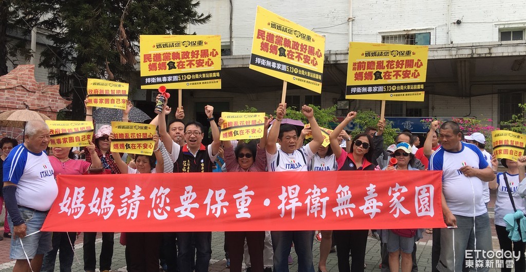 國民黨13日下午2時26分,全台同步發起「媽媽請你也保重—捍衛無毒家園」活動,在台南火車站前的快閃活動現場,有100多位民眾參與,台南市黨部主委莊占魁呼籲蔡政府,要正視人民走上街頭的情緒,要求民進黨承諾拒絕瘦肉精進口、絕不開放進口日本輻射食品、絕不放寬蔬果農藥標準。