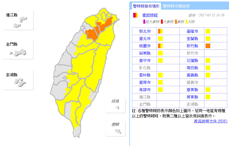 受到對流雲系發展旺盛影響,中央氣象局午後針對北北基等10縣市發布大雨特報。下午大雨特報範圍再擴大,包含台南、高雄等南部縣市持續發出局部大雨警戒,其中新北市、桃園市以及新竹縣3縣市升級成豪雨特報,要民眾注意雷擊、強陣風及溪水暴漲。