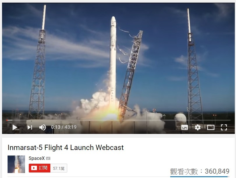 美國當地時間15日晚19時21分,火箭從佛州「卡納維爾角(Cape Canaveral)」的「肯尼迪航天中心(Kennedy Space Center)」進行發射,將「Inmarsat-5 F4」商用衛星送入軌道,未來將為航空班機和船隻乘客提供包括無線網路連接在內的信號發送。