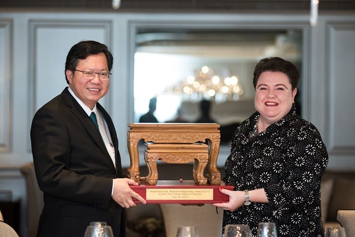 受到歐洲經貿辦事處(EETO)馬澤璉處長的邀請,桃園市長鄭文燦16日和歐盟會員國的駐台代表們一同享用午餐,出席時還贈送桃園大溪的特產「女俠木雕神桌」作為禮物,他強調「這是台灣人家裡常有的神桌,充滿祝福的力量」,同時也為桃園交了許多歐洲朋友。