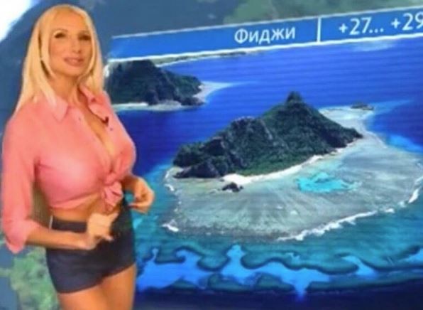 俄羅斯STS電視台的43歲氣象主播斯拉德科娃(Larissa Sladkova),擁有FF罩杯的傲人身材,也時常穿著比基尼播報氣象,卻引來部分網友批評「胸大無腦」,甚至還傳出下海賣淫的謠言,對此,她也親上火線霸氣回應。「話題製造機」斯拉德科娃是在5年前開始「造山」,先從C升到DD級,之後又向上提升到驚人的FF。