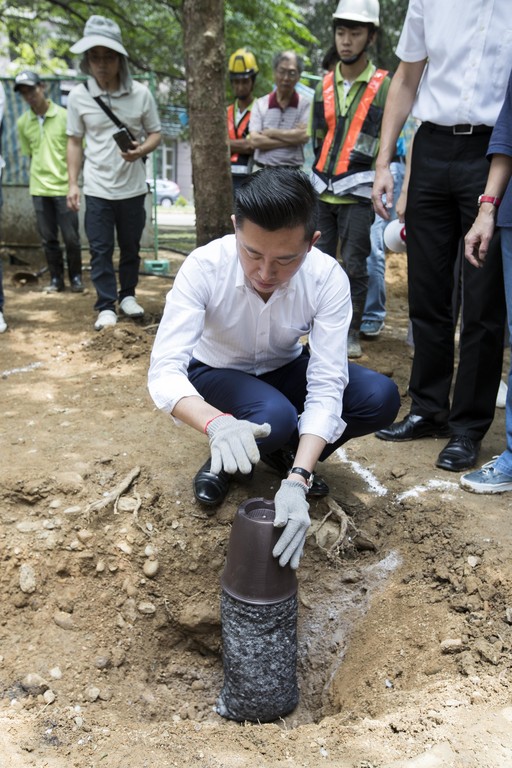 「新竹公園樹醫師診斷示範活動」戶外示範課程17日登場,由樹醫師示範操作空氣挖掘機,市長林智堅則為營養不良的茄冬樹剪除如同「尿布」的美植袋,並放置日本引進之「酸素管」,透過增加營養劑及根系的氧氣量,讓樹木根系吸收養分、改善生長,宛如替樹木「進補」一番。