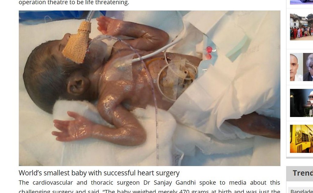 印度拉賈斯坦邦(Rajasthan)一名只有470公克的早產兒近日成功接受心臟手術,他同時也是世界上最小的嬰兒。男嬰的雙眼、肺及皮膚都未發育完成,身體非常脆弱,不能隨便移動或觸摸,因此這項手術有很大的風險與挑戰性。