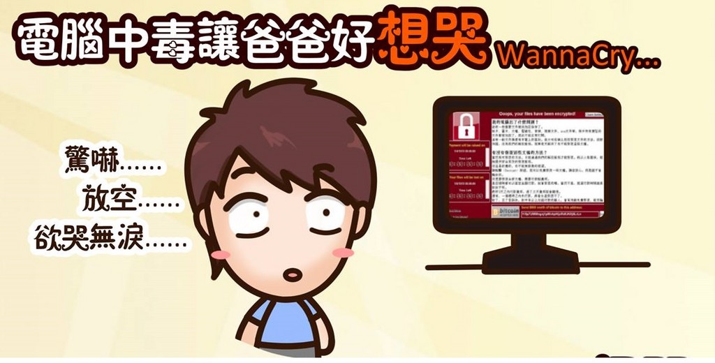 勒索病毒(Wanna Cry)肆虐全球,受害人數高達30萬人,台灣也被列為第二大受災地區,趁著這股風潮,網路上也出現許多惡搞的圖文。親子作家「食尚夫妻」就表示,在寶寶哭鬧的時候,爸爸常常中了「睡眠的勒索病毒」,讓媽媽「快要崩潰(Wanna Crazy)!」