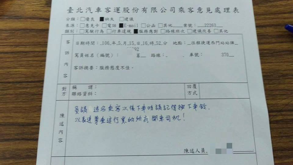 一名網友於臉書《爆料公社》貼文,表示日前遭一名乘客投訴,從申訴內容可見,乘客與友人在刷完卡後站在前門口等待下車,司機問:「你們是這一站下車嗎?」,乘客答:「對!」接著司機問:「那為什麼不按鈴?你們又不是搭捷運,捷運才不用按鈴」。讓他們相當氣憤,認為司機口氣很差、態度惡劣,事後將事發過程寫下後向客運公司投訴。