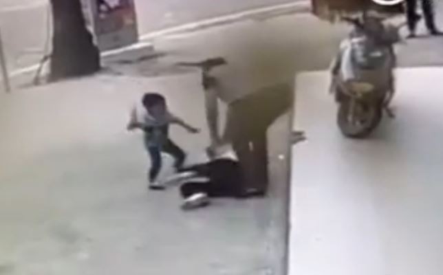 廣西藤縣藤州鎮一對夫妻日前在街上因口角發生肢體衝突,丈夫將妻子壓在地上捶打,完全沒顧慮到年幼的兒子也在一旁。令人心酸的是,兒子見狀以後,先是傻住,接著突然撲向父親,揮舞著自己小小的拳頭,想阻止父親動手,保護母親。