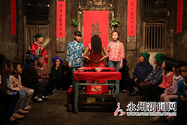 現代人結婚已經非常簡便,只要雙方到戶政事務所登記就能得到結婚證書,兩人正式成為夫妻。雖然還有人會遵照傳統婚禮,但通常都會刪去許多繁瑣的細節。中國湖南的零陵區的「塘付村」古城,這裡有個嫁娶的傳統習俗,即新娘要披「黑蓋頭」,讓披挾帶鳳的大紅色中顯得非常另類。