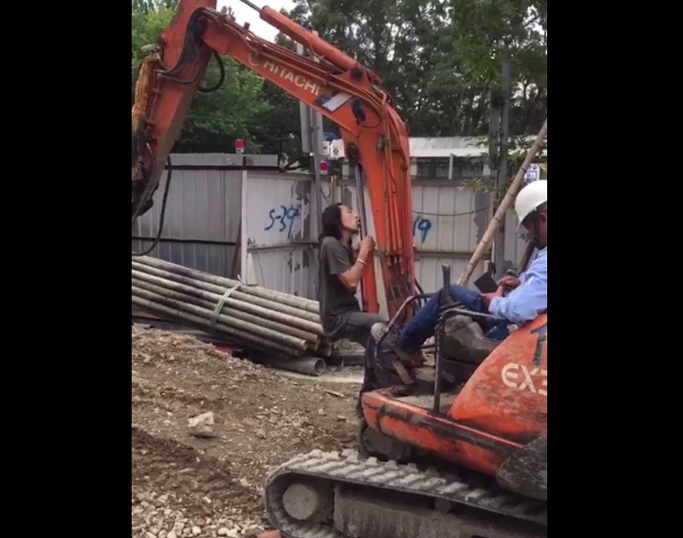 護樹聯盟23日在現場阻擋施工,一位工人疑似不斷受到阻撓情緒失控,將發動中的電鑽對準護樹團人員亂揮一通;日前更有一位自稱「按摩人」的張姓男子,直接爬上發動中的挖土機,接著發動全身的力量,一邊扭動身軀,一邊伸舌狂舔金屬油壓桿,工人只能無奈的滑著手機。