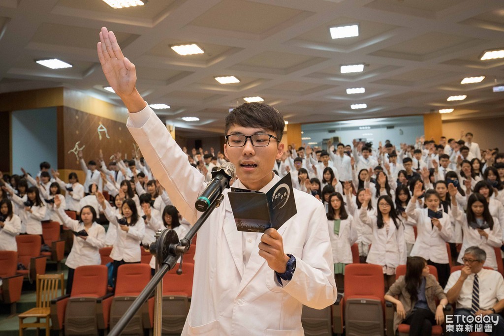 ▲學生代表引領全體實習生舉手宣讀藥師誓詞,代表藥學生對自我的期許,也是開始擔負責任的承諾。(圖/嘉藥提供)