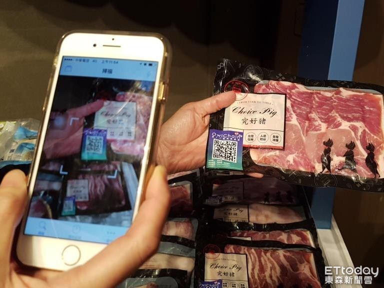 ▲想知道買到的食材來源安不安全,只要掃一下產品QR code,就能透過食品區塊鏈溯源系統「OwlChain」看到食品產銷流程各環節的資訊,例如食用的豬肉來源、何時施打疫苗等過程皆能一目瞭然。(圖/記者洪菱鞠攝)