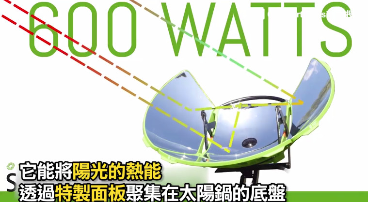 國外有家公司設計出一款不用瓦斯就能炒菜的「太陽鍋」,它的原理是將陽光的熱能透過特製面板聚集後,集中在底盤,並讓這些強化過的熱能,將鍋子中的食物煮熟,更可以在寒冷地方使用。
