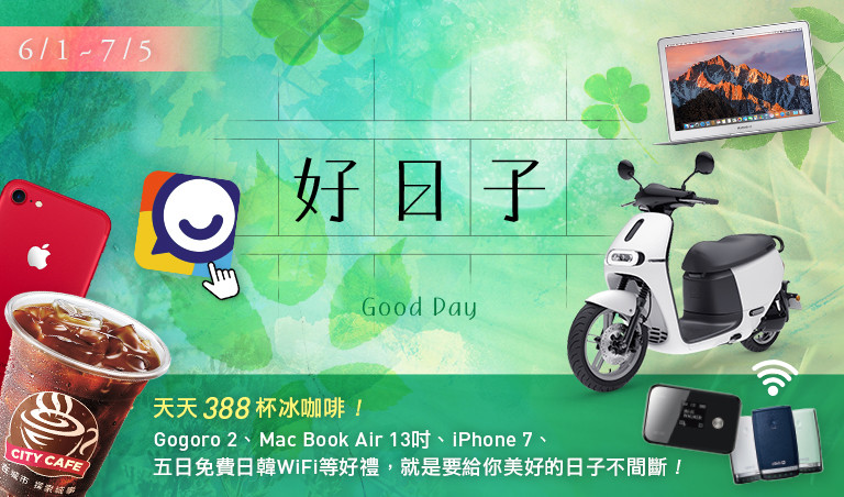 是不是非常簡單呢?在ETNEWS APP「好日子Good Day」活動中,每天看新聞收集好運秘訣還能抽大獎,收集越多中獎機率越大唷,冰咖啡、Gogoro 2、Mac Book Air 13吋、iPhone 7、五日免費日韓WiFi等好禮抽不停!馬上行動GOGOGO~