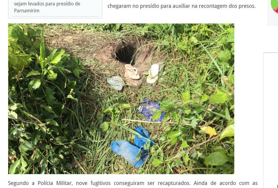 巴西東北部北大河州(Rio Grande do Norte)的帕納米林監獄(Parnamirim)25日傳出有犯人集體越獄,91名囚犯利用一條30公尺長的地道越獄,出口附近還留下不少藍色短褲和白色上衣的囚衣。當地警方目前僅抓回9人,其他仍有82名犯人在逃。