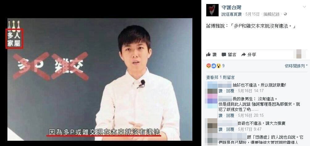 苗博雅發現,其中一個抹黑她的粉專稱要檢討校園性平教材,卻擷取了一張她的截圖影像,將「多P或雜交現在本來就沒有違法」畫上底線,沒有附上前後文,也沒有附上完整影片連結,是相當具有誤導性的表現手法,也不意外,底下出現未查證的錯誤解讀,指責她推廣多P雜交、教小朋友多P雜交,各種無厘頭謾罵湧出。