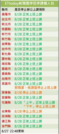 根據氣象局27日7時15分發布的最新颱風消息,中颱天秤(編號第14號,國際命名:TEMBIN)偏北移動,高雄、屏東、台南、台東、綠島、蘭嶼都列入陸上警戒範圍。有關27至28日的停班停課消息,《ETtoday新聞雲》也將為大家隨時更新。