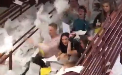 據《NBC》新聞報導,當天是學校考試的最後一天,學生們趁畢業前在樓梯間集合,倒數3秒後將大量考卷、講義從樓梯間砸下,許多學生直說「太爽啦」,還有學生在推特上po出影片表示,「巴沙我們走囉」。據了解,這個拋筆記的瘋狂儀式是學校傳統,每年畢業生均會在樓梯間大拋筆記,當中不少人更在1年級時就開始儲存筆記。