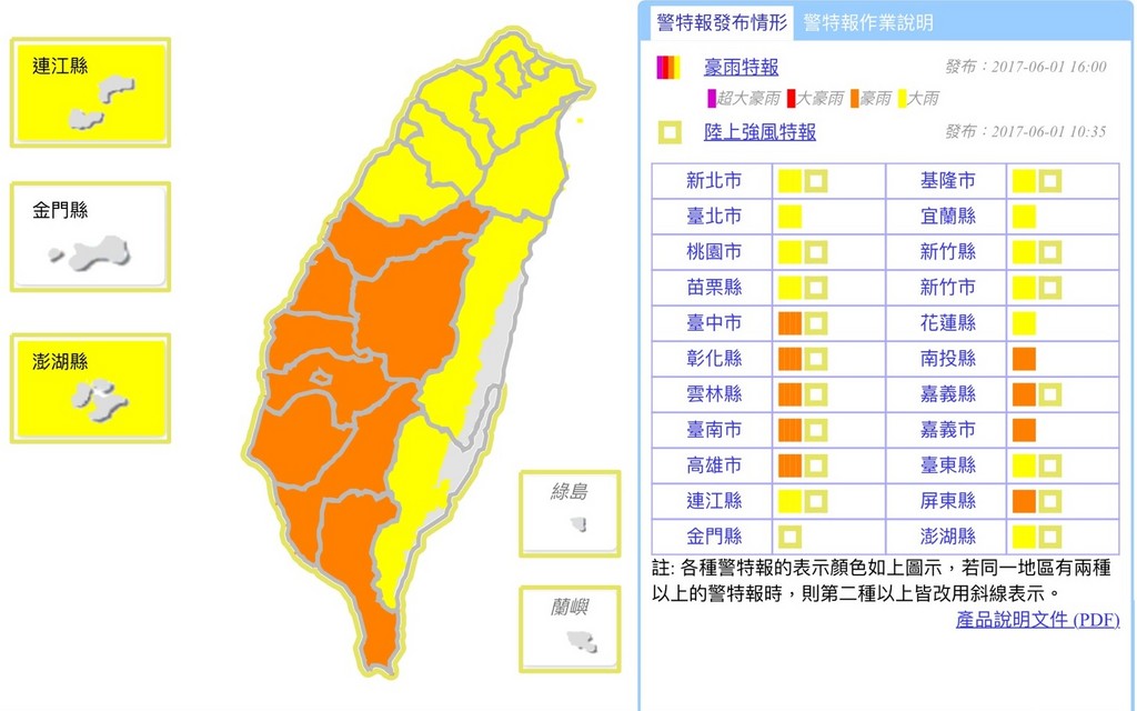 受到西南氣流及滯留鋒面影響,今(1日)下午至明(2)日台灣中南部地區有局部大雨或豪雨發生。氣象局表示,明日北部、東北部地區及東部、東南部山區、澎湖、馬祖亦將有局部大雨或豪雨發生的機率,請注意瞬間大雨、雷擊及強陣風,山區慎防坍方、落石、溪水暴漲,低窪地區慎防淹水。