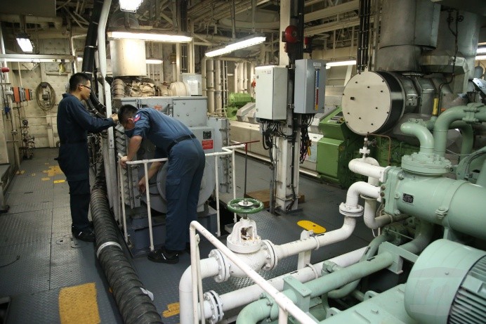 如果把船艦比喻成人體,那麼輪機就是它的內部臟器,負責「供給能量、消化廢物、調節體溫」等機能,缺一不可,讓艦上官兵能正常生活作息,航訓期間,由專業修護小組成員,每天24小時,和高溫、油污、噪音及數以百計的系統儀表為伍,在大家看不到的艙底下,周密檢查中央控制室操控系統、主機與發電機等輪機核心裝置,遂行各項任務,這些食衣住行等「最重要的小事」,就是輪機部門官兵的首要工作。
