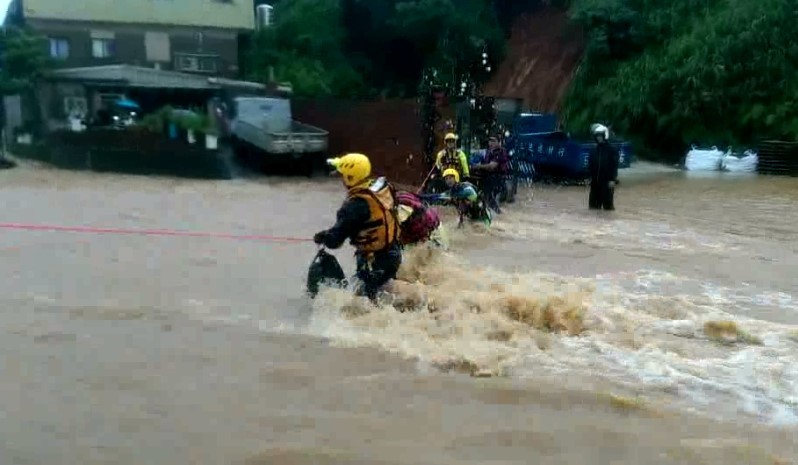 北海岸2日凌晨4時許開始下起豪大雨,多處道路因淹水封閉,淡水區的情況也相當嚴重,新北市消防局公布一段淡水區新庄子58號前的影片,只見滾滾泥水覆蓋路面,流速相當快,深度約到大腿部位,消防人員拉繩索協助3名民眾「渡河」,場面相當驚險。