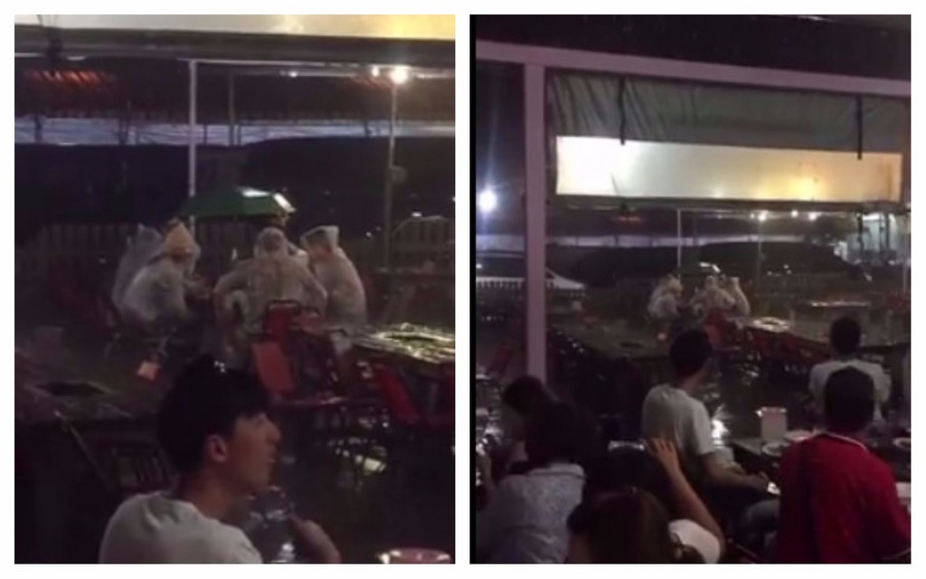 中央氣象局2日晚間發布豪雨特報,由於旺盛對流雲系逐漸接近澎湖地區及其海域,澎湖將有局部大雨或豪雨。但大雨也澆不熄「吃貨」的心,網路近日流傳一段影片,一間燒烤店的客人不畏暴雨,仍在戶外用餐區中穿著雨衣淡定烤肉,讓在場民眾看傻眼。