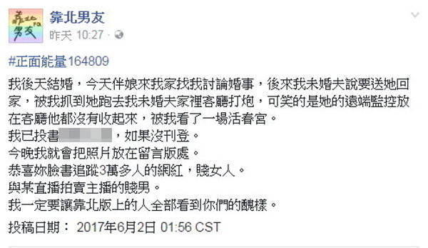 原PO稱,已投書平面媒體,如果沒刊登,「今晚我就會把照片放在留言版處。恭喜妳臉書追蹤3萬多人的網紅,○女人,與某直播拍賣主播的○男。我一定要讓靠北版上的人全部看到你們的醜樣。」