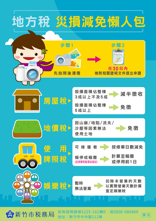 如果您在本市的房屋、土地或汽機車,符合上開地方稅減免標準,請於規定期限內向稅務局提出申請。如您仍有任何疑問,歡迎利用稅務局免費服務電話0800-086969或撥03-5225161轉213,或新竹市政府服務專線1999將有專人竭誠為您服務,您亦可利用稅務局網站https://www.hcct.gov.tw查詢相關資料。