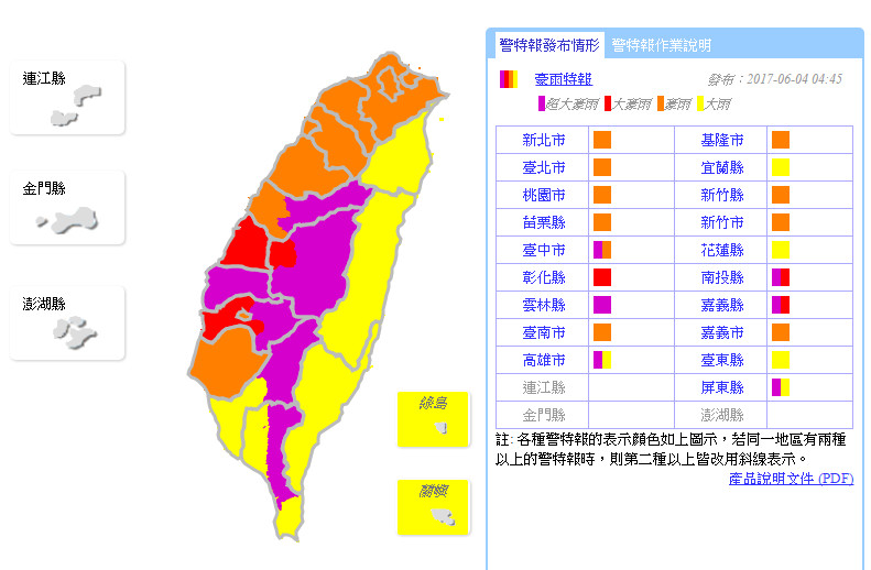 超大豪雨:台中市、雲林縣、南投縣、嘉義縣、高雄市、屏東縣