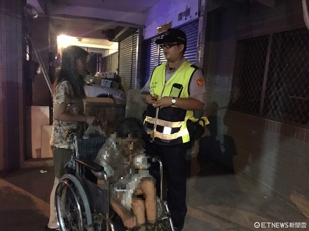警員柯俊成到達鹽水溪橋上,找到該名女子時,發現輪椅上還坐著一名男子,立即將警車停放在後方警示,並指引2人到路旁。經詢問發現女子回應遲緩,而輪椅上之男子身上僅穿著透明塑膠雨衣及四角內褲,且傳出濃厚排泄物臭味。