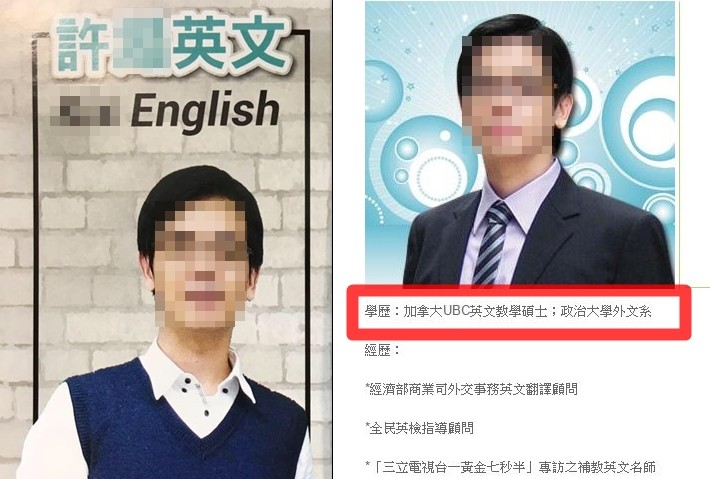 才女作家林奕含自殺事件震驚全國,進而催生補習班「實名制」,名師本名和最高學歷全都得上網登錄。不過有網友發現,台南市一名許姓英文名師(本名楊XX),在線上教學網站上學歷寫得是政大外文系、加拿大UBC(英屬哥倫比亞大學)英文教學碩士,但在教育局的資料卻是台科大工業管理系。