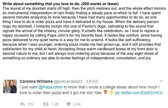 披薩熱好者卡諾琳娜表示,「看到作文題目後,應該寫下頭海中的浮現的第一件事情,這才是最真實的。」而她也因這篇短文,被耶魯大學取錄。耶魯招生官事後接受採訪時表示,「同是披薩愛好者,閱讀卡諾琳娜的申請短文後,忍不住笑翻,然後無法克制的訂購了披薩!」