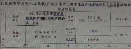 然而,卻有網友於臉書《靠北警察》粉絲專頁貼出一張「警力部署表」的照片,派警前往林飛帆的婚宴現場進行維安,讓基層員警怒轟「憑什麼這樣的人、這樣的婚禮,需要擬定警力佈署表?」更有網友狠酸,「難道還要守洞房?」