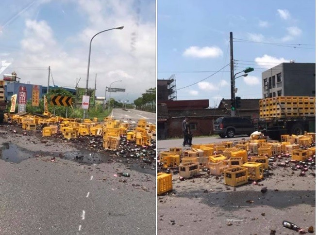 這輛載有台灣菸酒公司啤酒空瓶的拖板車,8日上午10點多,行經宜美路和大福路三段路口,疑似在轉彎時,第一節板車繩索沒綁緊鬆脫,讓車上2貨櫃的空瓶全翻落地面,碎片四散飄出濃濃酒味,所幸沒有人員傷亡,警方到場後也趕緊指揮交通,駕駛和清潔隊人員連忙清理碎片,目前酒瓶數量還在統計中,附近民眾經過嚇壞,照片PO上爆料公社,「差點淋啤酒了!」「用啤酒幫馬路消消暑 。」「聞到都醉了。」