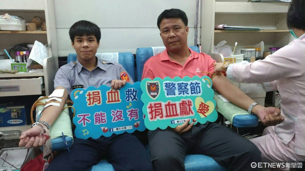台南市警善化警分局慶祝警察節,8日在善化區公所前舉辦「熱血傳愛」捐血活動,由分局長呂世明帶頭挽袖,警員高嘉南、高偉恩父子檔也一起響應捐血,包括警友、協勤民力及民眾共襄盛舉,共募集了近3百袋的熱血。
