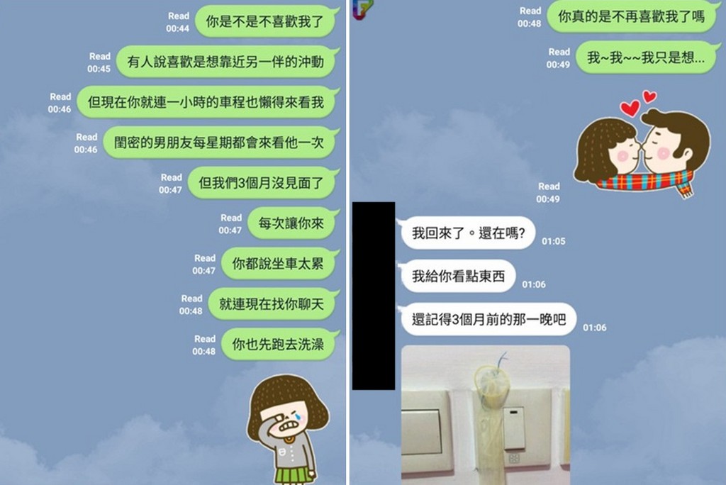 等到男生洗完澡回來之後,為了證明自己的一顆真心向著女友,傳了一張「用過的保險套」照片,並且寫著「還記得3個月前的那一晚吧,包括你當天的兩條頭髮,我都收藏起來了」,還表示自己一直貼在「床頭」,夜夜睹物思人。