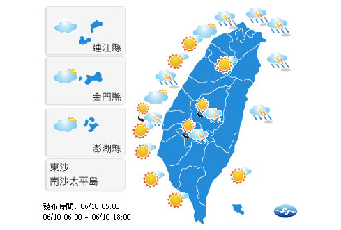 昨(9)日天氣晴朗炎熱,西半部白天高溫升至34、35度,午後也有局部陣雨或雷雨,大部分再山區,部分平地也受到影響,今(10)日清晨各地晴到多雲,上午依然是晴朗炎熱,午後也會有短暫陣雨發生。