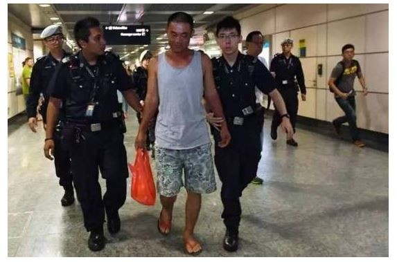 ▲中國工人的行李箱導致新加坡地鐵關閉,被逮捕時面露尷尬笑容 。(圖/翻攝自網易/下同)