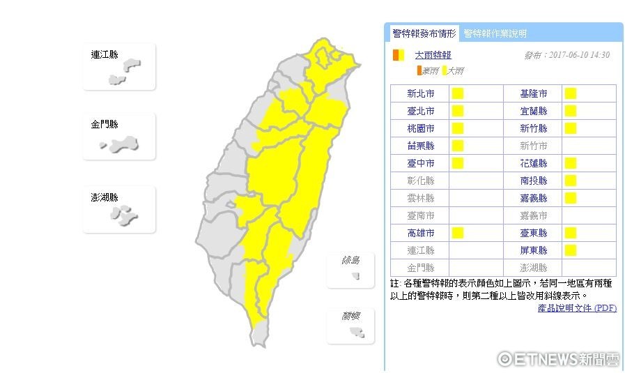 氣象局表示,因為午後對流發展旺盛,容易有短時的強降雨,今(10)日午後對全島14縣市發布大雨特報,分別為新北市、台北市、基隆市、桃園市、新竹縣、苗栗縣、台中市、花蓮縣、南投縣、嘉義縣、高雄市、台東縣與屏東縣。
